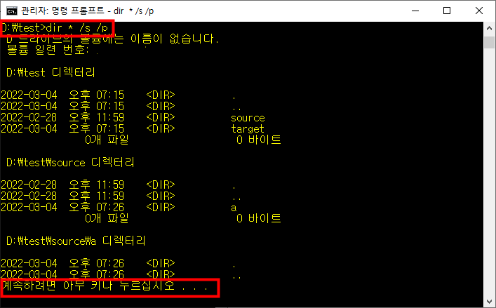 이럴 때는 '/p' 옵션을 추가하면, 위 예제와 같이, 페이지 별로 검색결과를 끊어서 보여줍니다.
