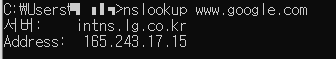 해당 명령어와 검색하고자 하는 도메인명 또는 호스트명을 입력하면 입력한 도메인에 맵핑된 ip내역이 뜸.