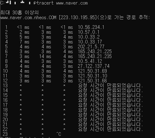 ping은 해당 호스트의 ip주소를 알 수 있다면, tracert는 현재 내가 접속한 네트워크 환경에서부터 접속하고자 하는